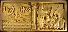 It is disputed that there are between 38 and 70 figurative plaques, thirteen medallions, and seventeen border carving fragments.[2][8] The majority of the Salerno Ivory panels are well-preserved and in excellent condition.[3] They are carved in relief into flat segments of ivory. There are eighteen plaques that depict scenes from the Old Testament.[9][10] These plaques are on average 12 cm to 24 cm wide and about 9 cm tall, while many of the New Testament plaques average 24 cm tall and 12 cm wide.[3] Cornices and borders average from 21 to 25 cm long by about 7 cm wide.[11] The supporting columns are about 23 cm by 2 cm and the busts are 6 cm squared.[11] Most of the plaques are divided into an upper half and lower half and contain two separate scenes, with a few exceptions.[3][2] The plaques that depict the Old Testament are oriented horizontally, whereas the plaques that depict the New Testament are oriented vertically.[3]