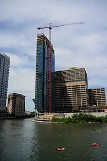 In May 2013, opponents of the planned development filed suit in United States Federal Court.[21] On November 19, 2013, U.S. District Judge Amy J. St. Eve ruled that the valuable and iconic views of downtown are not something that can be constitutionally protected saying "Illinois courts do not recognize property values, air, or light as constitutionally protected property interests."[22] The Wolf Point Towers broke ground in March 2014.[23] Neighboring Wolf Point West Tower had its groundbreaking ceremony on July 18, 2014.[24] The building opened for residence on January 13, 2016.[25]