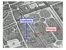 The indoor riding academy called the Salle du Manège (French: [sal dy manɛʒ]) was the seat of the various national legislatures during most of the French Revolution, from 1789 to 1798. It was demolished in 1804 to make way for the rue de Rivoli.