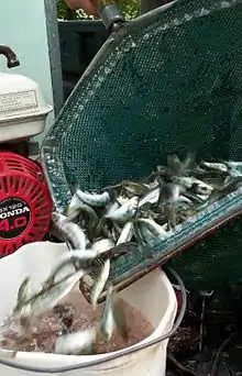 Snagging, the indiscriminate taking of fish using weighted hooks that are ripped through the water with quick jerking motions, was controversially outlawed on the Salmon River in the early 1990s.[28] It had previously been argued that snagging was ethical due to the difficulty in enticing Chinook and coho salmon to strike, as these fish die after spawning and do not feed once they enter the river. However, proponents of the snagging ban noted that the river also contained several species that survive beyond their spawning seasons, such as steelhead, brown trout and Atlantic salmon; snagging could not possibly avoid impacting these fish as well.[44] In addition, snagging opponents claimed that the practice was unethical as it violated the doctrine of "fair chase", and noted that snagging was associated with both injuries and problematic behavior, such as littering, the targeting of fish merely to harvest their eggs for profit, and fistfights among anglers.[45][46]