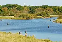 The majority of sportfishing activity on the Salmon River takes place on the portion of the river that stretches between Lake Ontario and the Lighthouse Hill Dam in Altmar. Here, anglers target river-running salmon and trout species that move upstream from the lake in order to spawn. The anadromous sportfish species that comprise these seasonal runs are the Chinook salmon (Oncorhynchus tshawytscha), coho salmon (O. kisutch), brown trout (Salmo trutta), Atlantic salmon (S. salar), and winter and summer-run strains of steelhead (O. mykiss). Salmon fishing on the river is accomplished either by casting from shore, using waders to fish from within the river, or fishing from a drift boat, typically operated by a guide.[33][34]