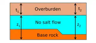 | 2 | Constant, | The thickness of overburden still remain constant however there is elevation head gradient, leading to h1 > h2 and causing salt flow from da direction of higher to lower elevation head gradient. | ![]() Uniform thickness of overburden but with a difference in elevation head. Modified from Hudec & Jackson, 2007.[1] | ||