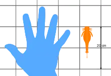 The specimen BGS GSM Zf-2864 is the most complete known specimen of Salteropterus, preserving the telson along with the tenth to twelfth abdominal segments. In this specimen, the entire telson measures 3.1 cm (1.2 in) in length and 1.3 cm (0.5 in) in width. Larger specimens are known however, with a specimen described by Henry Woodward in 1864 measuring 1.6 cm (0.6 in) in width.[1] A small part of a tergite (specimen BGS GSM Zf-2866) preserves large and raised triangular mucrones (median spines on the outer surface). The largest such mucrone (0.4 cm, 0.15 in, in width) suggests that Salteropterus could grow much larger than the known small specimens would suggest.[1]