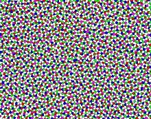 Jiao, Torquato, Joseph Corbo and colleagues presented the first example of disordered hyperuniformity found in biology, namely, photoreceptor cells in avian retina.[78] Birds are highly visual animals with five different cone photoreceptor subtypes, yet their photoreceptor patterns are irregular, which less than ideal to sample light. By analyzing chicken cone photoreceptors, consisting of five different cell types, it was found that the disordered patterns are hyperuniform, but with a twist - both the total population and the individual cell types are simultaneously hyperuniform. This multihyperuniformity property is crucial for the acute color vision possessed by birds. Elsewhere, Lomba, Torquato and co-workers presented the first statistical-mechanical model that rigorously achieves disordered multihyperuniformity in ternary mixtures to sample the three primary colors: red, blue and green.[79]