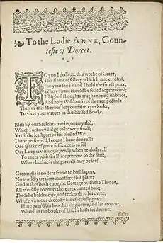 As their titles suggest, the ten prefatory poems were each dedicated to a woman Lanier was inspired by, influenced by, or hoped to attract as a patron.[3] These dedications were used to "assert the dignity and merit of all women" by declaring the greatness of the women she wrote to.[4]
