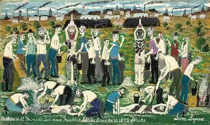 Crowd scenes depicting town life in the early days of Broken Hill are a recurrent theme in Sam Byrne's paintings. So too are scenes of violent clashes between miners and law enforcement authorities; often watched on by townsfolk spectators. Sam Byrne's characteristic treatment of crowds is to paint giving frontality to human figures.[4] By painting all characters facing the viewer, Byrne achieved a means to convey their emotional reaction to the folk story that is being depicted.[92] Although his faces tend to be crude and cartoonish, the subtle positioning of dots in a character's eyes still manages to evoke their distinct emotional states. Painting the correct facial expression was of importance to Byrne; often his faces would build up like impasto in multiple attempts at achieving the correct state.[70] Comparison has been drawn between Byrne's figures and the crowds in the London streetscapes of L. S. Lowry.[93] For author Geoffrey Lehmann, Sam Byrne's human figures appear "puppet like", as if all actors on a staged narrative, small and standardised against a dominating landscape, and rarely with any emphasis on any individual figure.[84] Byrne's focus on human subjects is significant to a region whose art was otherwise dominated by landscapes and mining scenes.[91]