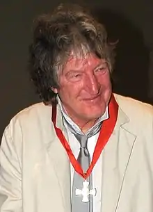Hunt's distinctive appearance – tall and thin, usually wearing long, tight, trousers ("Foxton straights" he has called them) with vests and open-chested shirts, with long hair curling wildly above a well-worn face – is complemented by the familiar gravelly drawl, the rhythmic, sometimes staccato and sometimes incantatory quality of his recitation (often tapping his fingers or flicking a hand to emphasise the poetic beat) and the execution of occasional small dance-like steps of concentration. These have all made him one of New Zealand's most recognisable figures.[3] Once, almost as well-known was his long-time travelling companion, the dog Minstrel. "A bard in the truest sense of the itinerant minstrel, Hunt's turangawaewae [i.e. 'one's own turf', literally: 'a place to stand'] is the public bar. Touring the pubs with bands of musos[20] and poets, he is himself one of the national icons".[21] Hunt is also a familiar figure in New Zealand figurative art, notably in paintings by Robin White, such as in Sam Hunt at the Portobello Pub,[22] painted in 1978.[21] In 2012, the artist Dick Frizzell completed a series of paintings of Sam Hunt poems. At the opening of the exhibition of those paintings on 7 February 2012, Frizzell said that he and Hunt had, in their respective paintings and poems, committed the ultimate "sin", the "sin of being understood".[23] [24]