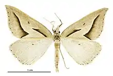 Primaries pale straw yellow ; an oblique interno-basal litura, a dot at the end of the cell, and a discal transverse line terminating in an acute < -shaped angle, piceous ; the discal line diffused externally ; a marginal series of black dots ; secondaries white, with the fringe creamy; a marginal series of black dots; thorax pale straw yellow, abdomen white : primaries below pale testaceous, whitish on internal area ; markings (excepting the marginal dots, which are united by a slender brown line) only visible through the wing ; secondaries white, the costal area tinted with testaceous, and sparsely irrorated with brown ; a small black dot at the end of cell ; a marginal series of black dots ; fringe creamy : body below pale straw yellow. Expanse of wings 1 inch 2 lines.[2]