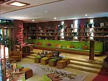 The color palette of furniture and design details is brighter and more saturated than other examples of Wright's architecture. This was prompted by Kay Christian who requested brighter colors against Wright's wishes. Wright was finally convinced by his wife, Olgivanna Lloyd Wright, who insisted that she would help the Christians with the color design.[5] The result was a palette of vibrant lime green, magenta, and purple combined with more subdued shades of orange, yellow, and beige (see image at left). The home was designated as a National Historic Landmark in 2015.[6] The nomination form[7] for the home provides a very detailed overview of the home with pictures and floor plans.[8] It was featured in a mid-2015 exhibit at the Portsmouth Art and Cultural Center.[4]