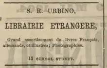 Prior to bookselling, Urbino worked as a teacher in Boston.[1] In the mid-1850s he bought "Miss Elizabeth P. Peabody's circulating library and book-store on West Street. He developed the library and also added German, French, and books in other foreign languages to his stock. He then ... began publishing the well-known series of Ahn's and Ollendorf's readers and grammars, and other text-books."[2][3] The business operated from an office on Summer Street (ca.1856)[4] Winter Street (ca.1857-1861)[5] School Street (ca.1864-1865)[6] and Bromfield Street (ca.1870).