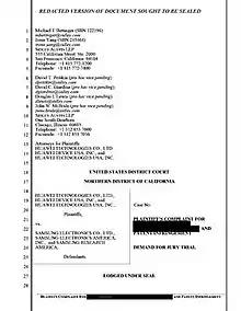 - Huawei Complaint CASE NO. 16-cv-02787-WHO Archived 2022-01-22 at the Wayback Machine