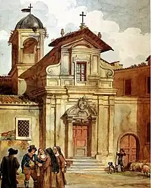 That ancient church fell into ruins in the early medieval period.[3] The cardinalatial title attached to the titulus Gai was subsequently suppressed by Gregory the Great and transferred to Santi Quattro Coronati,[3] and its Lenten station day was taken by the nearby church of Santa Susanna.[4] A convent operated on the site for another millennium, until Pope Urban VIII decided to clear what remained of the ancient church, and rebuild it from the ground up. To accomplish this, he retained Francesco Peparelli and Vincenzo della Greca as architects; the works lasted from 1630 to 1631.[1][2] The relics of Saint Caius were then brought out of the Catacomb of Callixtus, and brought into the newly rebuilt church dedicated to him.[5][6]