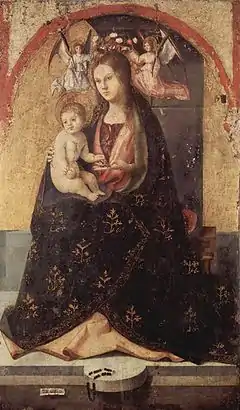 Five of the original panels in the polyptych, on two levels, survive. The lower level shows, at the center, the Madonna of the Rosary Enthroned, flanked by St. Gregory the Great at left and St. Benedict at right. The upper level depicts an Angel of Annunciation and the Annunciation, while a central panel, perhaps a Dead Christ Supported by Angels or a Deposition from the Cross, is lost.