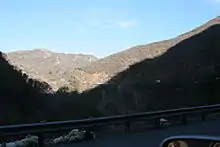 San Juan Creek begins in the southern Santa Ana Mountains, a few miles northwest of Lake Elsinore. Its highest elevation is 5,100 feet (1,600 m) above sea level.[1] Paralleling the Ortega Highway (California State Route 74) the creek flows erratically south, west and occasionally northwest. In the furthest upper reaches of the watershed, the creek is typically ephemeral. The creek channel in the uppermost few miles is a narrow mountain stream with many rapids and waterfalls, which include a series of large 5-to-15-foot (1.5 to 4.6 m) cascades, known as San Juan Falls.[2] There are little alluvial deposits in the canyons, and the creek mostly cascades over bedrock. In this upper reach, the pool-and-riffle stream channel structure is evident. There are a few developments within the area, but most of the canyon is too narrow for development, and the only major structure that influences the creek throughout San Juan Canyon is Ortega Highway, which follows the course of the entire canyon.[1][3][4]