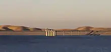 The San Luis Dam, a zoned compacted earthfill structure, is one of the largest embankment dams in the United States, with a structural height of 382 feet (116 m), a length of 18,600 feet (5,700 m) and a structural volume of 77,656,000 cubic yards (59,372,000 m3).[2][3] When full, San Luis Reservoir is more than 300 feet (91 m) deep, covers 12,700 acres (5,100 ha), and contains 2,041,000 acre-feet (2.518 km3) of water. The storage capacity of San Luis Reservoir is divided with 55 percent belonging to the state and 45 percent to the federal government.[8]
