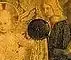 He also employs naturalistic effects of light and color combined with a variety of colors and patterns. The natural colors contribute to the slightly darker complexion of the painting, which may accentuate the sacred holiness of the moment. His usage of the red and blue traditional colors of the Virgin and Saints Cosmas and Damian is noteworthy.[9] By dressing both kneeling saints as well as several of the angels in red, Angelico creates a vertical link and further geometric stability. The symmetry resulting from the figures and colors allows the viewer to zoom-in and creates a smooth, continuous movement from figure to figure, eventually arriving at the Virgin and Child in the center. On the right, Saint Damian kneels on an inward angle towards the center praising the Virgin and Child, which draws the viewer's eyes towards the painting's vanishing point at the Virgin's chin.[10] The Virgin and Child are featured precisely at the vertical and horizontal axes' intersecting points and are placed above Angelico's trompe-l'œil depiction of the crucifixion.