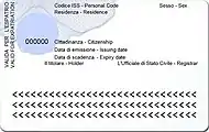 The issue of the San Marino identity card was governed only by the law of 20 January 1963, n.3, the law provided that the identity cards should no longer be issued by the Gendarmerie but by the Directorate of Civil Status Services and those still present. they had to be replaced within the year; the identity card had a value of three years for San Marino citizens and one year for resident foreign citizens.[1] The law 25 January 1990, n. 12 the identity card is also issued to resident foreigners who have reached the age of fourteen and a file is set up at the headquarters of the Gendarmerie and the duration of the identity card passes to five years.[2] With the law of June 17, 2004, n.83, the data of the file are entered in the computer database of the Civil Status Office and transmitted to the Gendarmerie[3] The Delegated Decree of August 16, 2016, n.105 provides for the issuance of the electronic identity card (CIE) for all San Marino citizens and for foreigners residing in the Republic, the signature is not required for children under 12 and the document is valid for five years and three years for children under six years of age,[4] the Decree was ratified on January 18, 2017.[5]