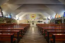 In its architecture, the church was conceived as a 'tent church'.[19] It features twelve stained glass windows, created between 1986 and 1992, which illustrate the seven sacraments, the birth of the Church, and Christ's incarnation, passion, death and resurrection. The current presbytery was added between 1999 and 2000.[7]
