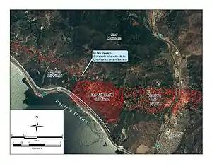 The San Miguelito Oil Field is a large and currently productive oil field in the hills northwest of the city of Ventura in southern California in the United States. The field is close to the coastline, with U.S. Highway 101 running past at the base of the hills and is sandwiched between the larger Ventura Oil Field to the east and the Rincon Oil Field, which is partially offshore, to the north and northwest. Discovered in 1931, and with about 7 million barrels of oil remaining out of its original 125 million, it ranks 44th in the state by size, and at the beginning of 2009 had 61 producing oil wells, all operated by Vintage Production California LLC, a subsidiary of Occidental Petroleum.[1]