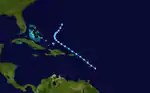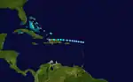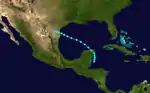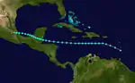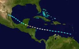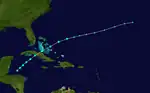 A tropical storm was first noted about 455 miles (730 km) northeast of Barbados around 18:00 UTC on September 8. It intensified on a west-northwest course, becoming a hurricane early on September 10 prior to moving through the U.S. Virgin Islands.[3] The hurricane continued into Puerto Rico – making landfall on the north coast of the island on September 11 – defying initial projections that it would pass safely north.[35] Early on September 12, the storm struck near Punta Cana, Dominican Republic as a minimal hurricane. The cyclone weakened to a tropical storm as it moved south of due west across Haiti, Jamaica, and the western Caribbean. At 19:00 UTC on September 14, it made another landfall north of Belize's border with the Yucatán Peninsula as a strong tropical storm. The cyclone emerged into the Bay of Campeche and quickly strengthened to its peak as a Category 2 hurricane with maximum sustained winds of 100 mph (160 km/h), making a final landfall just east of Veracruz, Veracruz, at 06:00 UTC on September 16 at that intensity. It rapidly weakened once inland and dissipated after 18:00 UTC.[2]