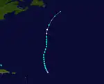 A tropical depression formed about 635 miles (1,020 km) northeast of the Leeward Islands around 06:00 UTC on September 23. The cyclone maintained a general northward heading throughout its duration. Peripheral data from nearby ships indicate it attained tropical storm intensity early on September 24 and gradually strengthened to a Category 1 hurricane four days later, with peak winds of 75 mph (120 km/h). A gradual weakening trend ensued thereafter, and the storm transitioned into an extratropical cyclone around 00:00 UTC on September 28 while to the southeast of Newfoundland. The post-tropical low turned northeast and persisted for a little over a day before it was absorbed by a front or dissipated.[2]