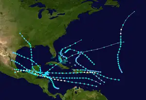 A total of thirteen tropical cyclones developed, the most since 1916, though many remained weak, with only three intensifying into a hurricane. Only one system, the British Honduras hurricane, reached major hurricane status, which is Category 3 or higher on the Saffir–Simpson scale.[1] Most of the storms also impacted land, but few left deaths or inflicted serious damage.[2] Six of the systems made landfall or moved across the Yucatán Peninsula.[3] Overall, the tropical cyclones of the season collectively resulted in $7.6 million in damage and approximately 2,533 deaths, with the vast majority of the destruction being caused by the British Honduras hurricane.[5][6][7][2][8][9]