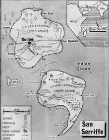 San Serriffe is a fictional island nation invented for April Fools' Day 1977, by Britain's The Guardian newspaper.[1] It was featured in a seven-page hoax supplement, published in the style of contemporary reviews of foreign countries, commemorating the tenth anniversary of the island's independence, complete with themed advertisements from major companies. The supplement provided an elaborate description of the nation as a tourist destination and developing economy, but most of its place names and characters were puns and plays on words relating to printing (such as "sans-serif" and names of common fonts). The original idea was to place the island in the Atlantic Ocean near Tenerife, but because of the ground collision of two Boeing 747s there a few days before publication it was moved to the Indian Ocean, near the Seychelles islands. Because of this late decision, the authors made San Serriffe a moving island – a combination of coastal erosion on its west side and deposition on the east cause it to move towards Sri Lanka, with which it will eventually collide, at about 1.4 kilometres per year (0.87 mi/a).