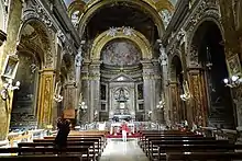 It is believed that the high altar, which predates the present church, was influenced by the style of Michelangelo. The interior is rich in marble, gilding, and artistic decoration. The nave has an Assumption with Saints frescoed (1680) by Giacinto Brandi. The main altar carved ciborium or canopy (1667) by Carlo Rainaldi. The cupola was frescoed (1605) by Cristoforo Roncalli. A Martyrdom of San Stephan I and a Messengers of Constantine call on San Silvestro (1610) were frescoed in the apse by Orazio Borgianni. In the baptistry apse, there is a Baptism of Constantine by Ludovico Gimignani. The transept has a History of San Silvestro (1690) also by Gimignani, and a Madonna with Child by Baccio Ciarpi.