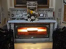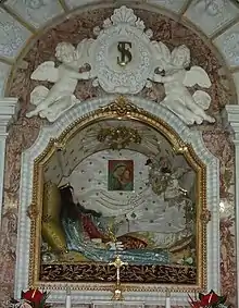 The construction of the building began in 1580 by the municipality of Mugnano del Cardinale.[2] The construction ended in 1600 and was named after Our Lady of Graces. The founder of the Sanctuary was Father Francesco De Lucia, born in Mugnano del Cardinale on September 19, 1772. Before entering the priesthood, he taught philosophy in the House of Iliceto, the novitiate of the religious of Alphonsus Liguori. After priestly ordination, on September 19, 1796, he settled in Naples, where he opened a school of philosophy and literature; in the capital of The Kingdom of the Two Sicilies, De Lucia was highly esteemed by some notable figures, including Bartolomeo De Cesare, future Bishop of Potenza, and Joseph Pignatelli, restorer of the Society of Jesus.[3] In 1805, De Lucia went to Rome to accompany the Bishop of Potenza, Bartolomeo De Cesare, on a visit to Rome on behalf of Ferdinand IV of Naples. On this occasion, thanks to De Cesare, he obtained the remains of Saint Philomena from Pope Pius VII, found in the Catacomb of Priscilla together with a small glass phial believed to contain the blood of Philomena.[4] The niche was closed by three tiles on which the following words were read: LUMENA | PAX TE | CVM FI, with the symbols of the lily, the palm and the anchor; the tiles were given on July 11, 1827, to the Shrine by Pope Leo XII. Back in Naples, with the presence of the Bishop of Nola Vincenzo Torrusio, the remains were placed in a statue of a girl covered in clothes donated by Angela Terres. They left Naples on the evening of August 9 to return to Mugnano on the morning of August 10, when the remains were placed in the Our Lady of Graces Church. In September 1805, De Lucia donated the remains to the municipality of Mugnano del Cardinale who in turn donated it to King Ferdinand II of the Two Sicilies on April 22, 1836, together with the church itself.[5]