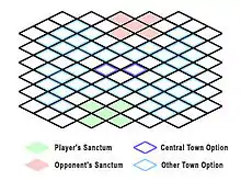 The game is played on a diagonally aligned grid of square tiles. The player's home base appears in the bottom rows, taking up five squares in a plus-sign shape; the opponent's sanctum similarly was located in the top rows. Five towns are placed on the board, one in one of the two center squares, and each pair of the other four are located closer to one sanctum than the other. No two towns are closer than two spaces apart, and each player's sanctum was the same number of moves to its closest town, and so on, such that no player has a tactical advantage from town placement. The rest of the squares of the grid are randomly assigned one of the basic terrain types: plains, forest, desert, water, swampland or mountains.