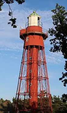 Sandhammaren is a Swedish lighthouse, and the name of both a beach and a point east of Ystad in Scania. At first two identical lighthouses were constructed, because it was a risk to mistake this lighthouse with the one on Ertholmene. The flame first ran on colza oil. Later on (1891), one of the lighthouses was put out of service and moved to Pite-Rönnskär in Norrland, at the same time the lamp was transformed to a paraffin lamp. The lighthouse was electrified in 1952.
