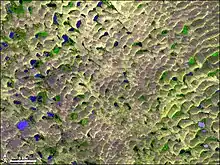 The Sandhills sit atop the massive Ogallala Aquifer; thus both temporary and permanent shallow lakes are common in low-lying valleys between the grass-stabilized dunes prevalent in the Sandhills.[4] The eastern and central sections of the region are drained by tributaries of the Loup River and the Niobrara River, while the western section is largely composed of small interior drainage basins.