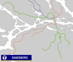 Sandsborg metro station is a station on the green line of the Stockholm metro, located in Gamla Enskede, Söderort. The station was inaugurated on 1 October 1950 as part of the inaugural stretch of Stockholm metro between Slussen and Hökarängen.[2] The distance to Slussen is 4.4 km (2.7 mi).