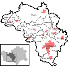 On 1 October 2005 the Verwaltungsgemeinschaft Sangerhausen, consisting then of 10 municipalities was dissolved and turned into the single town/municipality Sangerhausen; which meant that the 9 villages were truly annexed. On the same date Breitenbach, Großleinungen and Wolfsberg also joined, coming from the municipal association Roßla-Südharz. On 1 December 2005 Riestedt followed, coming from the Verwaltungsgemeinschaft Allstedt-Kaltenborn.[4] Finally, Wippra was incorporated on 1 January 2008, coming from the Verwaltungsgemeinschaft Wipper-Eine.[5]