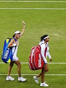 Mirza and her American partner Mattek-Sands advanced to the third round of the women's doubles competition at Wimbledon, where they fell to the Williams sisters.[29] On 26 June 2012, Mirza was awarded a wildcard entry hence confirming her participation in women's doubles event of the London Olympics.[30] On 17 July 2012, Mirza and her partner Mattek-Sands were ousted in the first round of WTA Premier event in the US.[31]