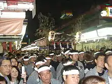 Sanja Matsuri (三社祭, literally "Three Shrine Festival"), or Sanja Festival, is one of the three largest Shinto festivals in Tokyo. It is considered one of the wildest and largest in Japan.[2] The festival is held in honor of Hinokuma Hamanari, Hinokuma Takenari, and Hajino Nakatomo, the three men who established and founded the Sensō-ji Buddhist temple. Sanja Matsuri is held on the third weekend of every May at Asakusa Shrine.[3] Its prominent parades revolve around three mikoshi (portable shrines referenced in the festival's name), as well as traditional music and dancing. Over the course of three days, the festival attracts 1.5 to 2 million locals and tourists every year.[4]