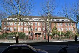 The building which is today known as the Altbau (literally: the old building) was erected in 1952/1953, based on plans of the architect Gerhard Kamps. Since 1968, it is listed in the official register (Denkmalliste) of the cultural heritage management of the state of Hamburg.[9] In 1970–1971, an extension building alongside the adjacent Alfredstraße was built and opened. In 2010, it was expanded with six new classrooms and an elevator.[5]