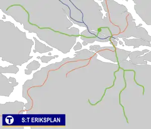 Sankt Eriksplan (often abbreviated as S:t Eriksplan) is a station on the Green line of the Stockholm metro. It is entirely underground, and is located in the district of Vasastaden, which is in the borough of Norrmalm in central Stockholm. The station has a single island platform, some 8 metres (26 ft) below street level, and is accessed via a pair of ticket halls. One ticket hall is under Sankt Eriksplan itself, and the other under the intersection of Torsgatan and Sankt Eriksgatan. Both ticket halls are linked to the surface by entrance pavilions containing stairs and lifts.[3][4] The distance to Slussen is 4.1 km (2.5 mi).[1]