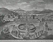 In a decree of March 28, 1702 to the Bayreuth city council, Margrave Christian Ernst of Bayreuth indicated that his son and heir Georg Wilhelm wanted to erect "various buildings" on the Brandenburger Weiher. Land was acquired for the construction project, with other parcels of pasture land given in compensation to its former owners. On September 2, 1702, Georg Wilhelm's wife, Princess Sophia, laid the cornerstone for the new planned suburb of Sankt Georgen. Since Georg Wilhelm spent a lot of time that year as a general in imperial service in the camp in the Rhine Palatinate, his mother Sophie Luise initially personally took charge of the construction project, but she died in October 1702.[13] In 1704 there is mention of the prince's "three houses in St. Georg am See"("St. George on the lake").[14]