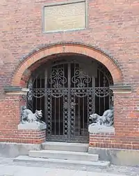 The school building at Larslejstræde 5 is from 1899 and was designed by architect Frederik Levy.[4] The school has also taken over the Pelts Plejestiftelse building at No. 7. This building is also from 1899 and was also designed by Frederik Levy. Both buildings are constructed in red brick with large, arched windows. No. 5 has a gate guarded by two granite lions.