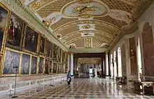 The gallery hall is magnificently designed with richly gilded ornaments on the slightly curved ceiling. The floor is laid out in matching colors with a rhombic pattern of white and yellow Italian marble. On the green walls, the framed paintings are laid out densely above and alongside each other in a Baroque style.