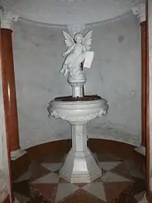 - The baptistry, dating back to 1948, houses a marble christening font adorned with an angel on its top.[3]
