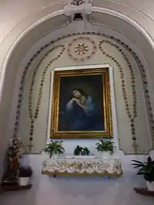 - In the second chapel: a canvas painting made in 1916 by Leonardo Mirabile from Alcamo and representing Our Lady of Confusion.[4] This painting is a copy of that one made by Giuseppe Renda dedicated to Our Lady of Sorrows, kept in the Chiesa di Santa Maria di Gesù (Alcamo), and stolen in 1979.[3]