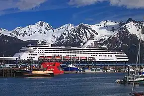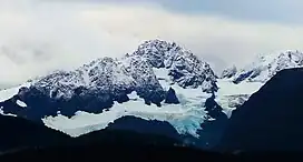 Santa Ana Peak is located eight miles (13 km) east of Seward in the Kenai Mountains, on land managed by the Alaska Department of Natural Resources. Precipitation runoff and glacial meltwater from the mountain drains west to Resurrection Bay via Fourth of July Creek and from the east slope to Day Harbor. Topographic relief is significant as the summit rises over 3,700 feet (1,128 m) above the creek in less than two miles (3.2 km) and 4,764 feet (1,452 m) above tidewater of the harbor in four miles (6.4 km). The mountain's toponym was officially adopted June 13, 2019, by the United States Board on Geographic Names.[1] The mountain is named for the wooden steamship Santa Ana which brought Seward's founders to this area in 1903.[1]