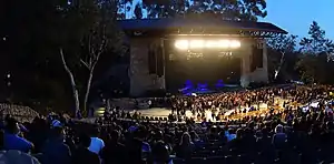 The amphitheater's original stage was a revolving wooden stage, but this was washed out during El Niño rains in 1939. The stage was replaced with a concrete slab that remained in place until renovation work in 2001.
