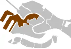 It occupies the north west part of the main islands, and can be divided into two areas: the eastern area being largely mediaeval, and the western - including the main port and the Tronchetto - mostly lying on land reclaimed in the 20th century.