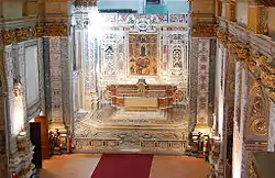 The altar was built by Giovanni Ragozzino based on a design by Solimena; it is flanked by an altarpiece by Luca Giordano. The dome was frescoed by Agostino Beltrano.