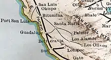 The first 3.26 miles (5.25 km) of track, from the Southern Pacific connection at Guadalupe to Betteravia Junction, was actually built by the SP in August 1899 to get to a sugar mill. The SP leased the track to the SMV years later. From Betteravia the SMV built to Santa Maria and on to Roadamite. The SMV also had branches running from Stowell to Air Base, Suey to Rosemary Farms and Rex to Gates.