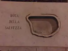 The church gave the name, Gancia Revolt (Rivolta della Gancia), to a failed 1860 plot against the Bourbon Government. With the aid of some of the Franciscans, some thirty conspirators had hidden themselves in the convent, but were betrayed to the police by one of the friors. On April 4, 1860, troops stormed the convent killing nearly twenty. Thirteen were arrested, but later executed without trial. Two were able to escape by hiding amid corpses in the crypt tombs, and later tunneling out through a small perforation in the wall (buca della salvezza) still marked on Via Allora.[3] A month later, the Expedition of the Thousand by Garibaldi liberated Palermo from Bourbon rule. The 13 men executed were honored with an Obelisk erected at the Piazza delle XIII Vittime at the intersection of Via Cavour and Via Francesco Crispi.