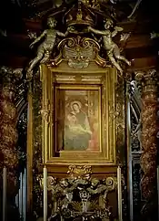 The tribune has a Baroque altar in the choir was begun by Mauro Oddi and completed in 1758-1765 by Andrea and Domenico della Meschina. The main altarpiece displays the famous icon inside a gilded frame replete with cherubs and putti and a gilded crown; the ensemble flanked by two King Solomonic columns flanked by two pillars. At the base are two statues, Saint Joseph and King David, sculpted by Francesco and Giovanni Baratta. In the hemicycle above the altar, is a large fresco depicting a Coronation of the Virgin with Saints (1541), painted by Michelangelo Anselmi.[5] He also painted the adjacent ceiling fresco depicting the Adoration of the Magi. Behind the altar is a semicircle of wooden choir stalls.